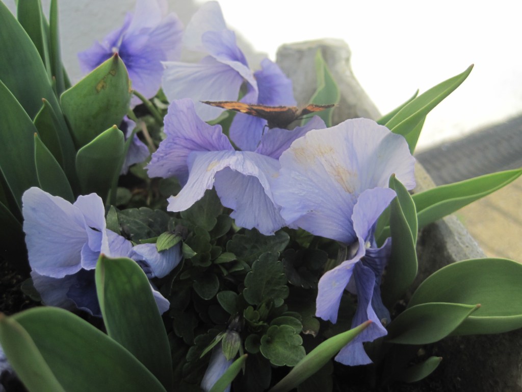 A butterfly was visiting the potted pansies and basking on the sunny house wall. It looked a bit ragged but was a welcome sight.