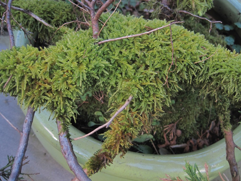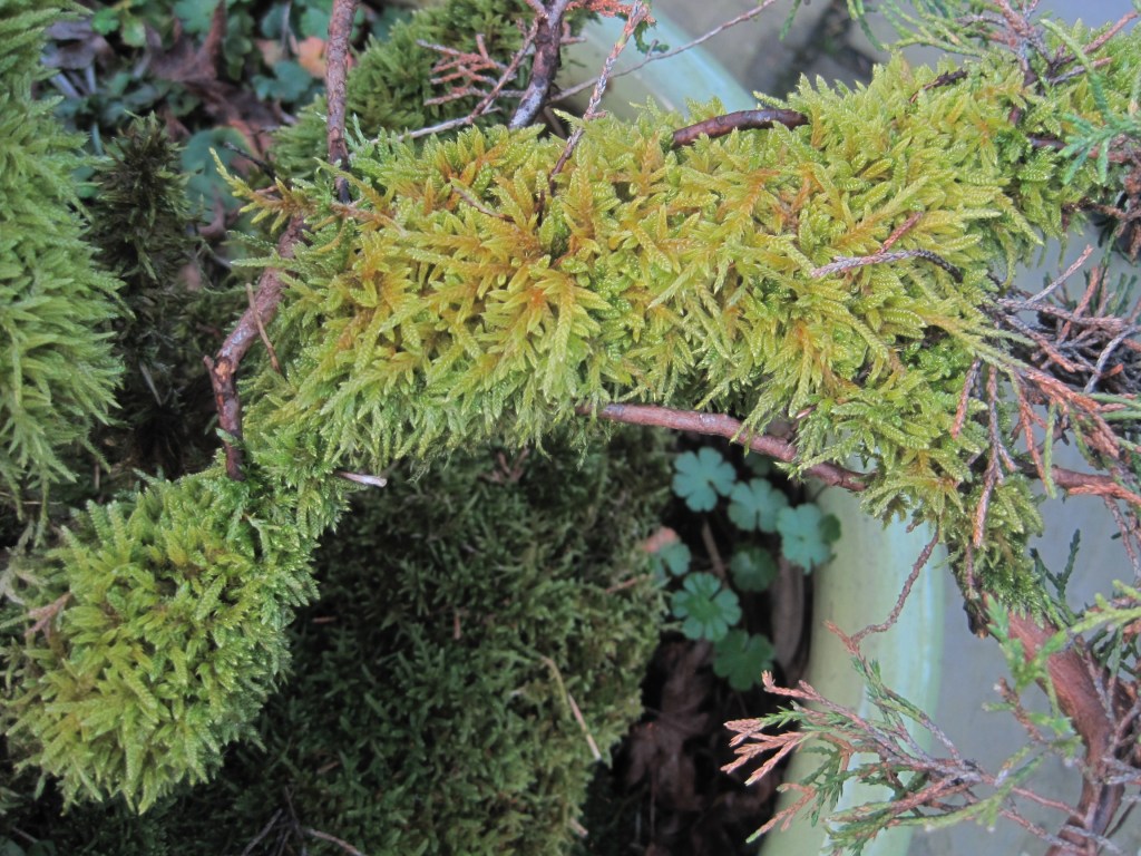 There’s a lot of moss in our garden. Many parts are shaded by the trees and this and the light sandy soil seem to encourage it . I even find it on the potted conifers, draped across the branches.