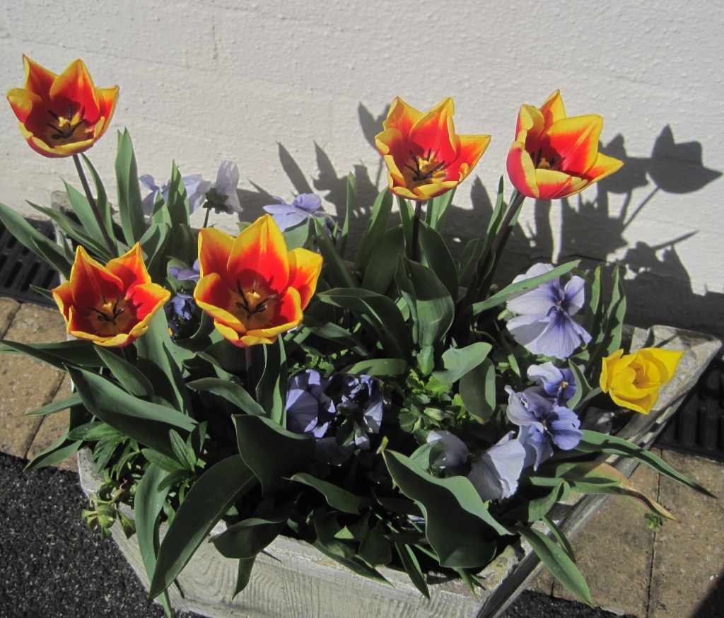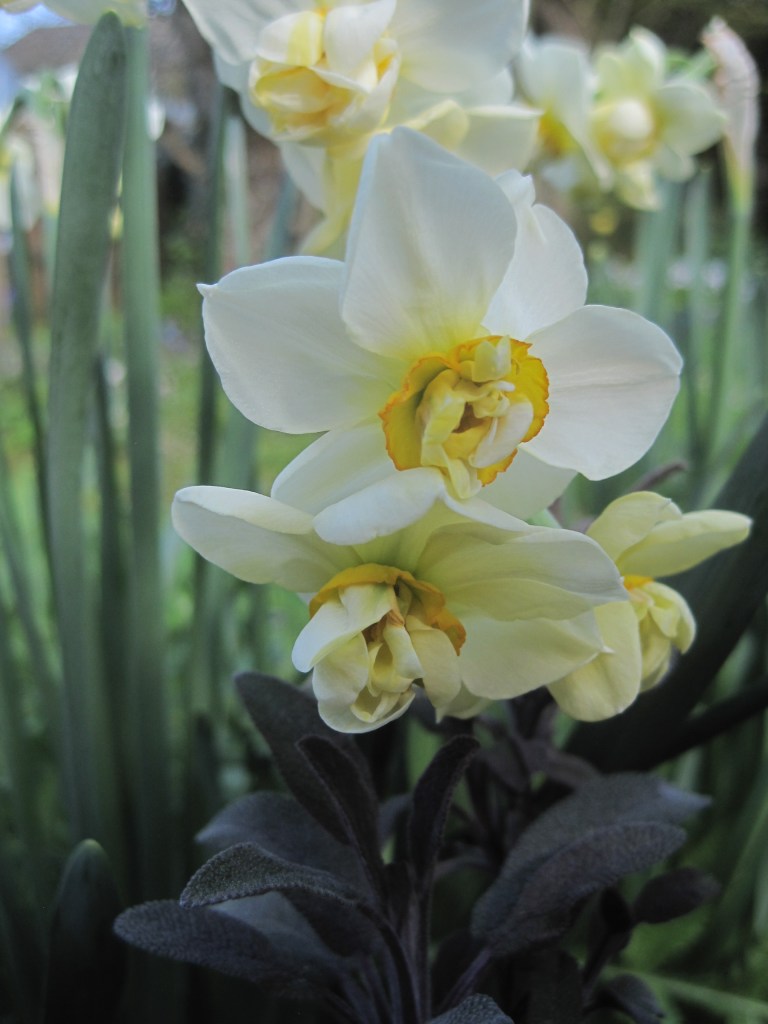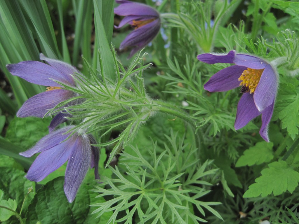The garden is a little mixed right now. The Pulsatilla, or “pasque flowers”, named for their habit of flowering at Easter are not putting on a show this year. Usually their lovely purple petals and feathery foliage are giving me such pleasure. Here’s a photo from previous years to show what they’re like.
