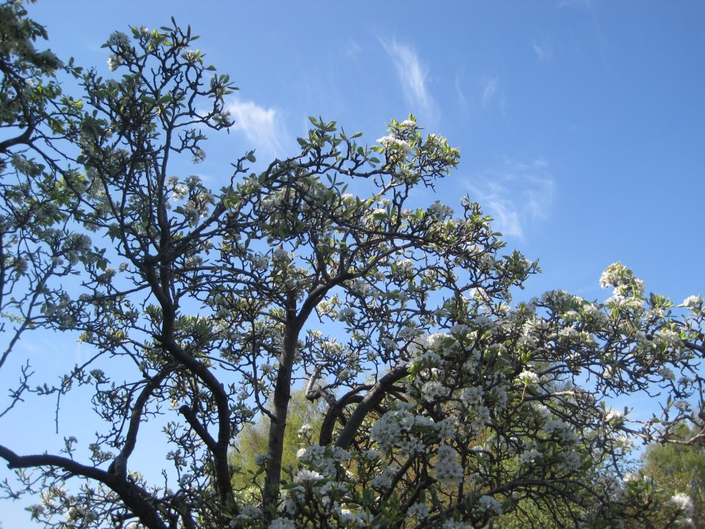 The pear trees are just beginning to burst their buds. The apples will be a little later. One of the pears stands just behind the house and gives a lovely view from an upstairs window when it blossoms.