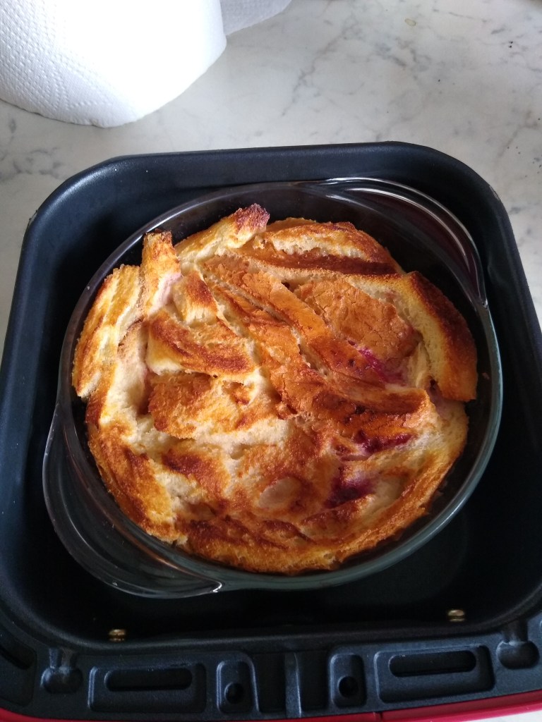 I’ve been using my fruit supplies from the freezer to make room for this year’s harvest. I had some frozen stewed plums and crusts from a bloomer loaf, so I made a bread pudding in my air-fryer on the bake setting. I put half the crusts in a bowl. I whisked an egg into 300mls of oat milk with two tablespoons of sugar and poured half over the crusts. Then I added the stewed plums covered with the rest of my crusts. I poured the remainder of the egg mixture carefully over the bread and pressed it down gently to make sure it was all soaked.