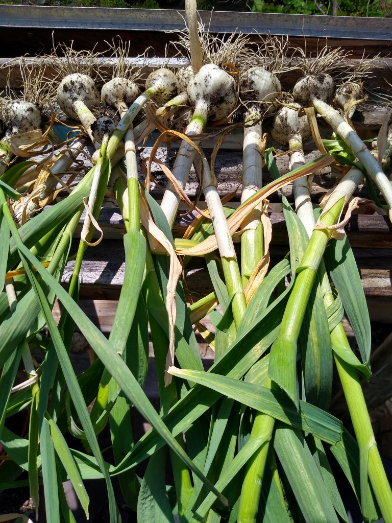I’ve harvested the garlic. Not a big crop but I’m pleased with the bulbs. I’ve spread them on an airy bench in the greenhouse to “cure” them. The sun and wind will harden the skins and wilt the stems so they’ll be ready for storing. There’s nothing quite like homegrown garlic; so fresh, sweet and full of flavour.