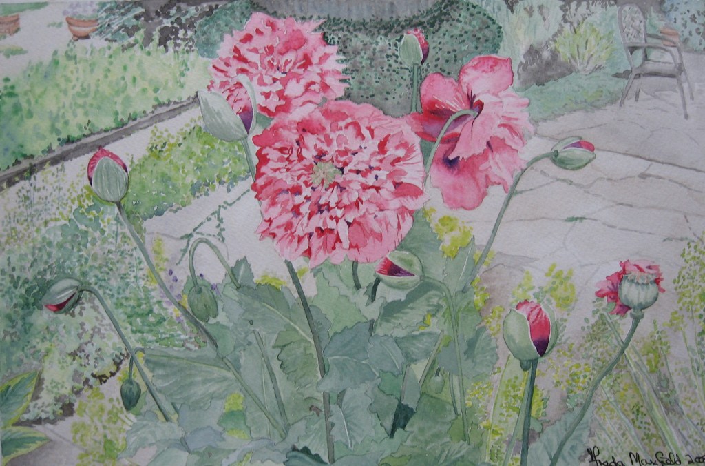 Meantime here’s an old one. These are opium poppies which pop up spontaneously every year in the garden. We had the old crazy paving when I painted this. The garden looks very different now. I took a photo and drew the image in pencil, then I painted it with gouache paint.