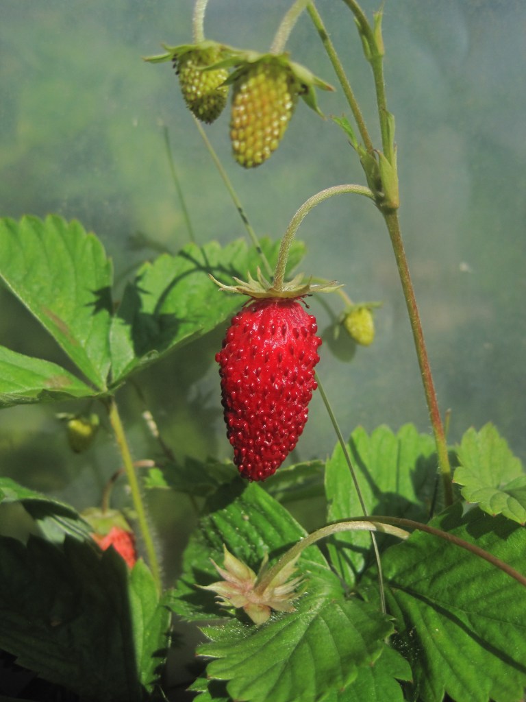 Wild fruits grow here and there in the garden. They look very decorative although they’re essentially weeds. The wild strawberries are nice to eat but you need a lot to gain a helping of them so I leave them for the blackbirds and mice. Blackberries are a nuisance with their thorns and their spreading habit but I must admit they look lovely and they feed the creatures who live in the garden.