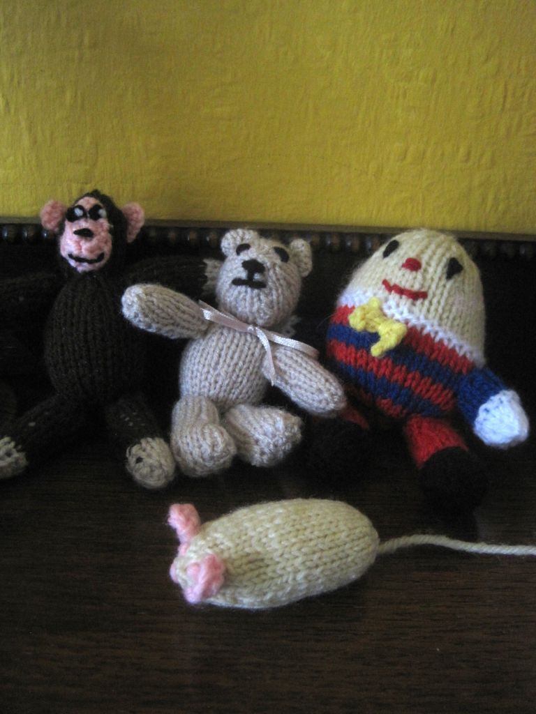 As the nights draw in my mind turns to crafty pastimes like knitting. I’m going to make some toys again to give away at Christmas. I made a tiny mouse just for starters but I intend to make some bigger toys. The mouse has been added to my little collection of toys which keep us amused.