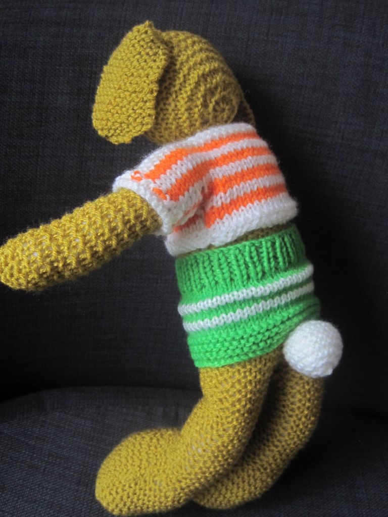 I used Val Pierce’s book, “Knitted Rabbits”. Easy patterns, quick to knit and enjoyable but I always find the hardest part of toy-making is stitching a face. Took three attempts with the rabbit.