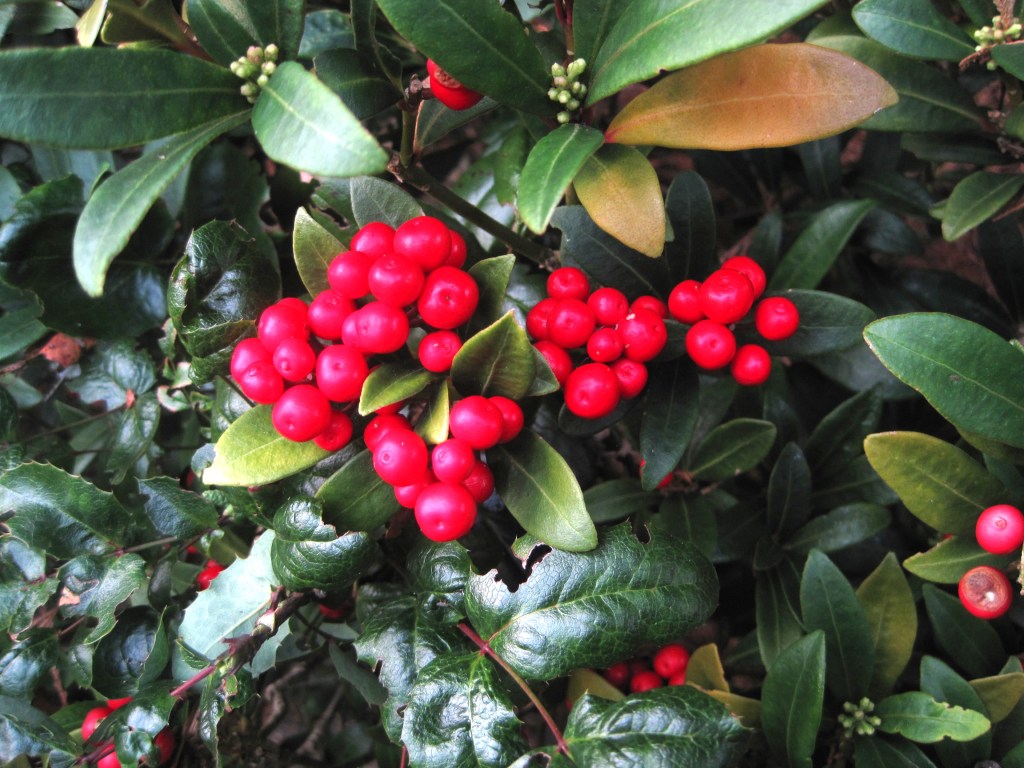 There are still textures and berries to enjoy here and there. The Garrya eliptica is growing its long tassels for a Spring show. The black grass Ophiopogon is always lovely at any time of year and the Viburnam and Skimmia have vibrant red berries.