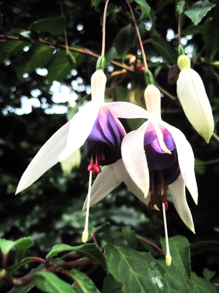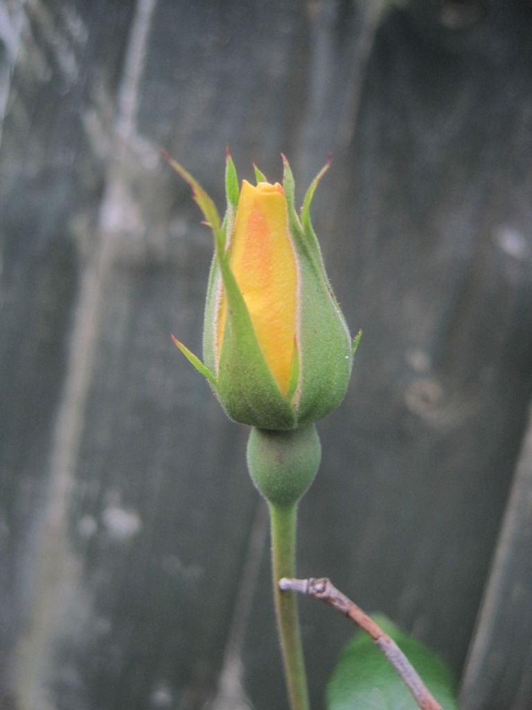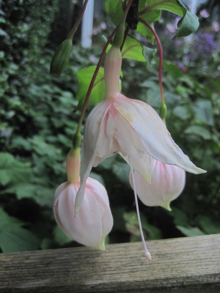 A solitary Nasturtium poked its pretty head up through the raindrops and a yellow rosebud stood tall against the fence. Fuchsias are still holding out against the wet weather.