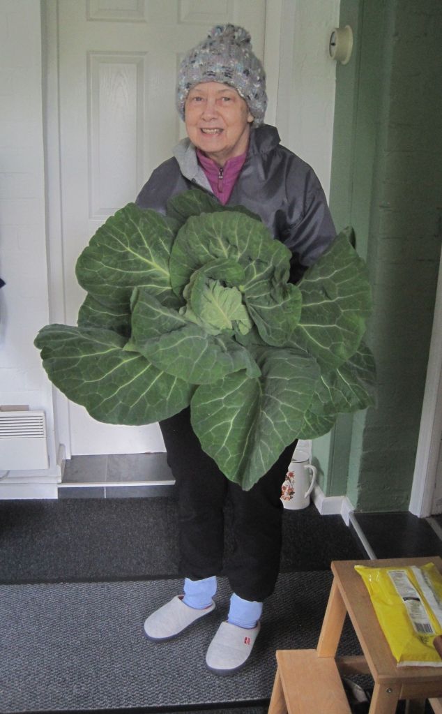 My Spring cabbages are growing well. These “Hero” ones form a ball head in two or three weeks time but I usually end up with too many to use at once. I decided to start using them while they’re not quite mature. This year the leaves are enormous. Allan took a photo of me bringing one in from the garden. It was nearly as big as me and filled the sink.