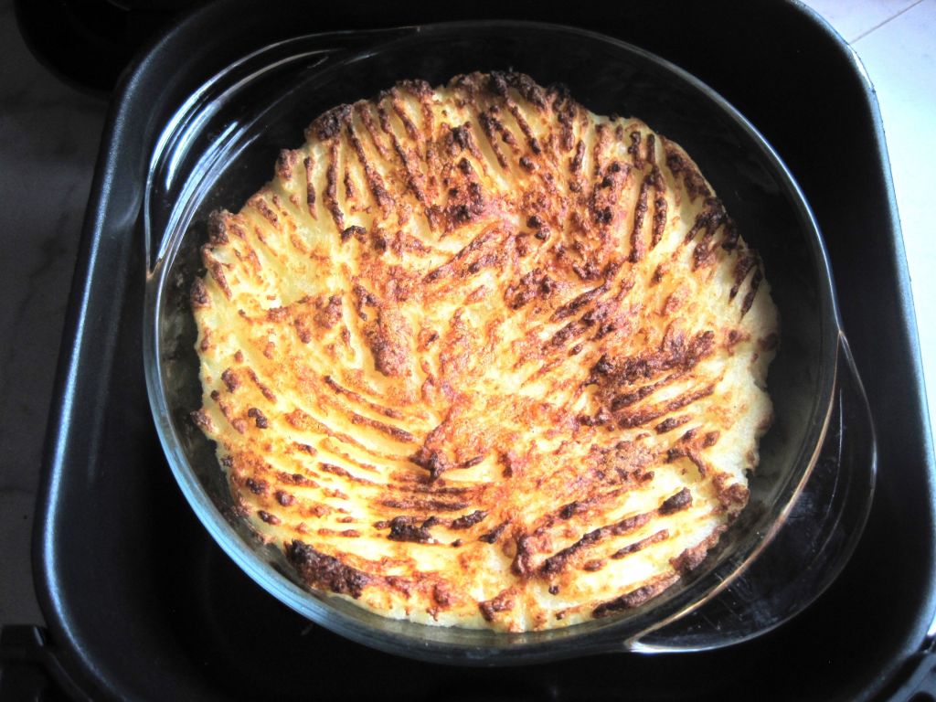The next day I made my cheesy potatoes. I boiled potatoes, mashed them with Cheshire cheese and added a little soured cream. While the potatoes were cooking I softened chopped onion in a little olive oil in the microwave. Then I added the cabbage and topped it with the cheesy mash. I baked it in my tiny airfryer for about twelve minutes at 173C until nicely browned and heated through.