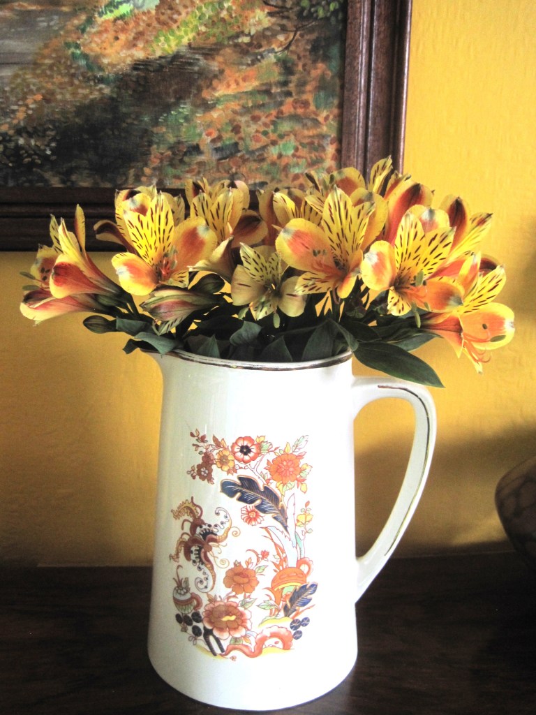 My Alstroemerias are flowering nicely. I brought in three stems for a vase and I love the autumnal look in the jug I put them in.