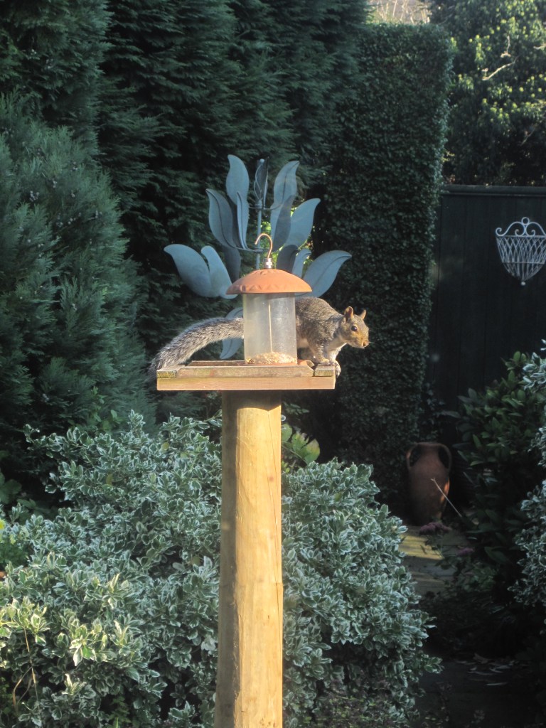 We’ve started feeding the birds again. I read that a Bluetit goes down to 10g in weight during the breeding season and needs to fatten up to 14g to withstand the Winter. The trouble is our small flock of sparrows is wiping everything out! Plus squirrels have been busy trying to access the feeders. Here’s one I snapped through the kitchen window.
