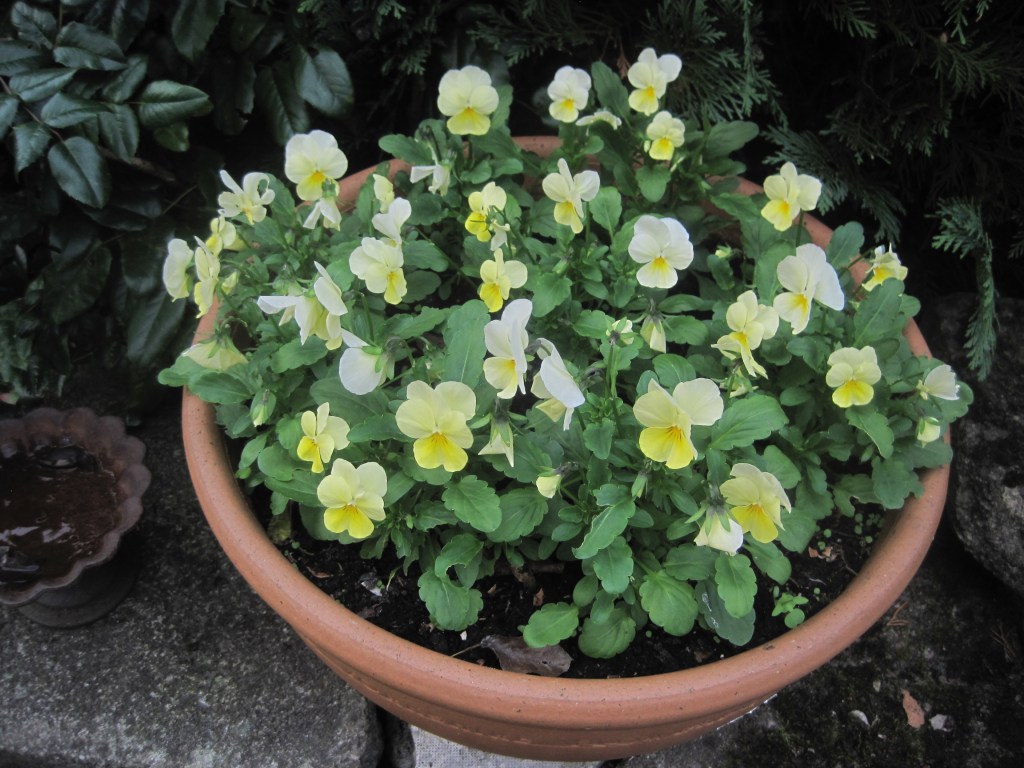 I’ve bought little violas to fill the pots. Cheerful yellow for most of them but two pots of a lovely pale purple as well. Such hardy plants and yet so delicate-looking and pretty.