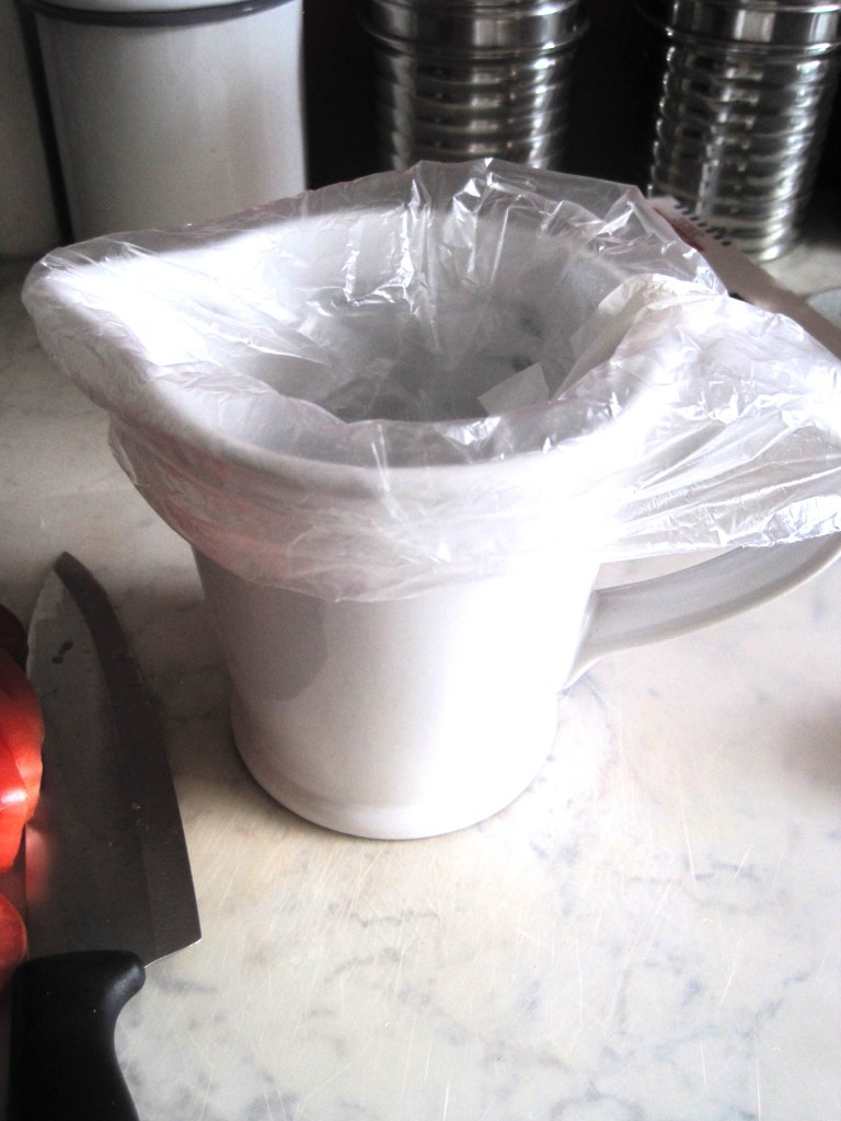 I froze some of my red tomatoes. Although I no longer buy polythene bags because I discovered they’re not recycled I still re-use old ones. Here’s a tip for filling bags for the freezer: to keep the bag open put it in a jug or bowl and fold the edge back over the rim. Easy to fill it this way.