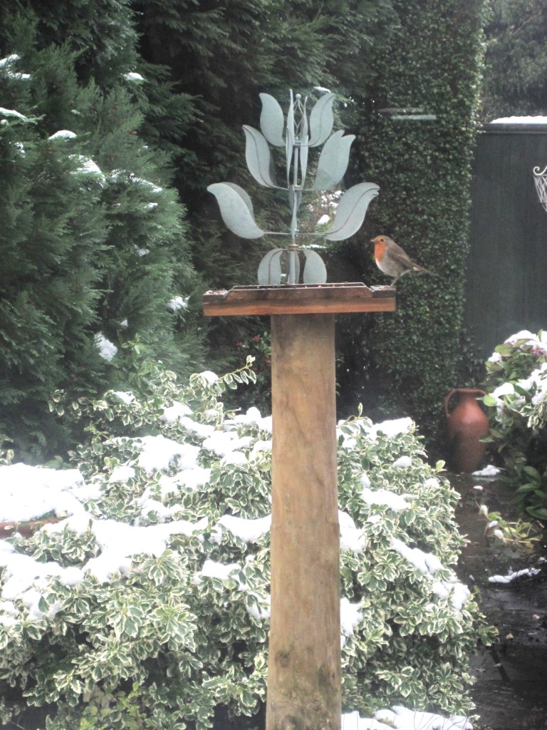 We’re feeding the birds of course, now that it’s colder. We have three feeders hanging from the pear tree and a small bird table. The old bird table had to be replaced. The new one has no roof so the bigger birds can perch easily and the squirrels have no trouble reaching the feeders or the table top.