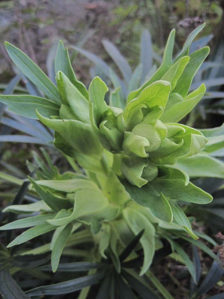 The garden is looking brown and drab now. I have to snatch precious glimpses of colour wherever they spring up. Along the side of the house a pretty little cyclamen has grown from a stray seed and our walk-through tunnel has winter jasmine flowers brightening the scene. Scarlet berries glisten on the skimmia and viburnum and the green hellebores are in bud.
