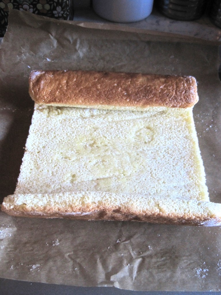 Holding the new paper against the cake, roll it up with the paper inside and leave to cool.