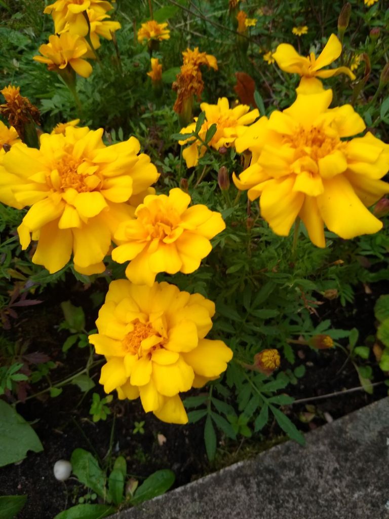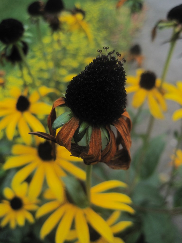 The marigolds have curled seeds which promise more beauty next summer and the Rudbeckias have almost black cones with bronze drooping petals as they slowly fade.