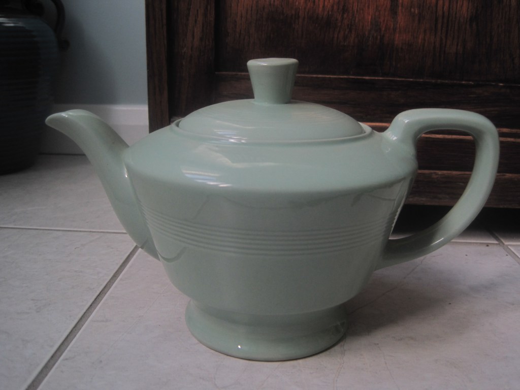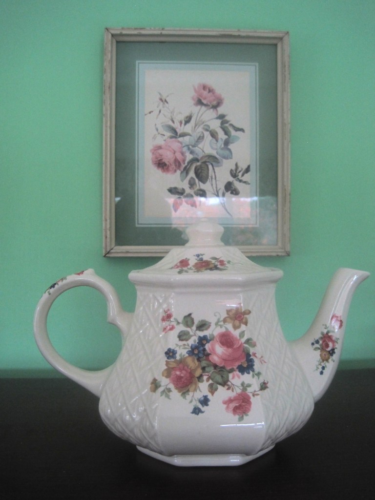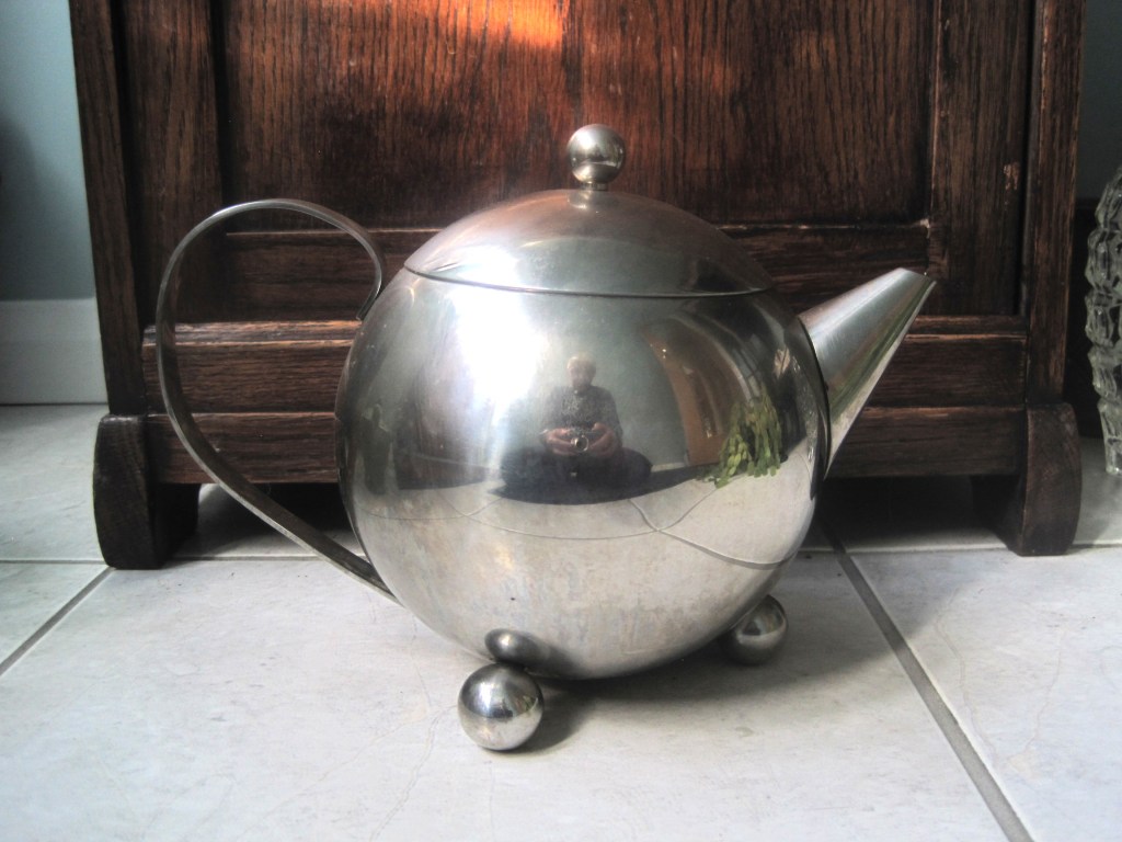 I also love teapots and have a few. Our everyday one is a dribbler without its lid but it makes just enough tea for the two of us. For guests I have a bone china one with gilt edging. We had a fad at one time for Lapsang souchong tea which has a satisfying smokey woody flavour and for that I used my little Chinese teapot with a dragon design. But I have two teapots purely because I love the look of them. One has a lovely chintzy flower pattern and is in the bedroom just to look pretty and the other is an Art Deco one which stands in the kitchen. I also have an ornate Indian one (which needs a good polish!) and another Art Deco green one. Last, but not least, I have a metal one with a nice round belly.