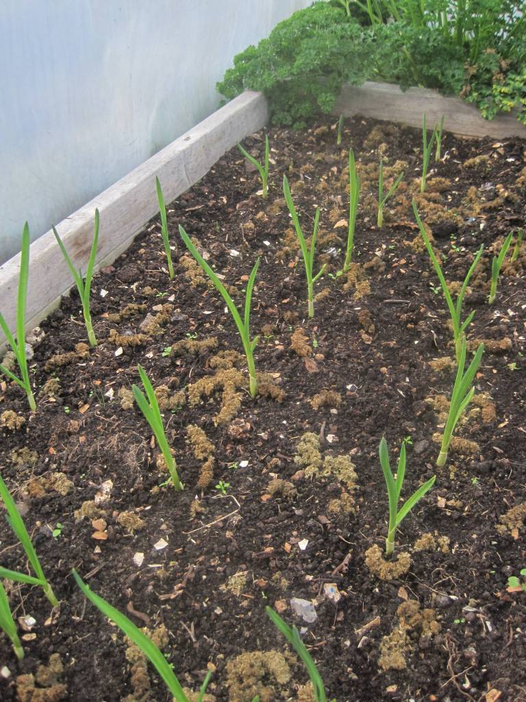 The garlic is growing well. I scattered comfrey pellets around them to add nutrition. They’re breaking down now and I need to carefully work them into the soil.