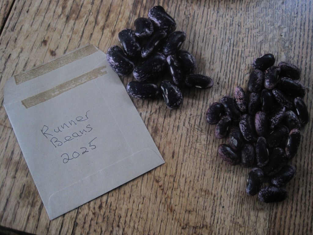 The runner beans had their fling and it was time to save seed. I let some pods dry on the plants, then removed the beans. These are now stored in a little brown envelope and will grow next year’s crop. I haven’t bought runner bean seeds for many years. It’s so easy to do this and very satisfying. The seeds need to be fully dry and stored in a dark, cool place until next Spring. These are an old variety called “Scarlet Emperor” and they’re very reliable.