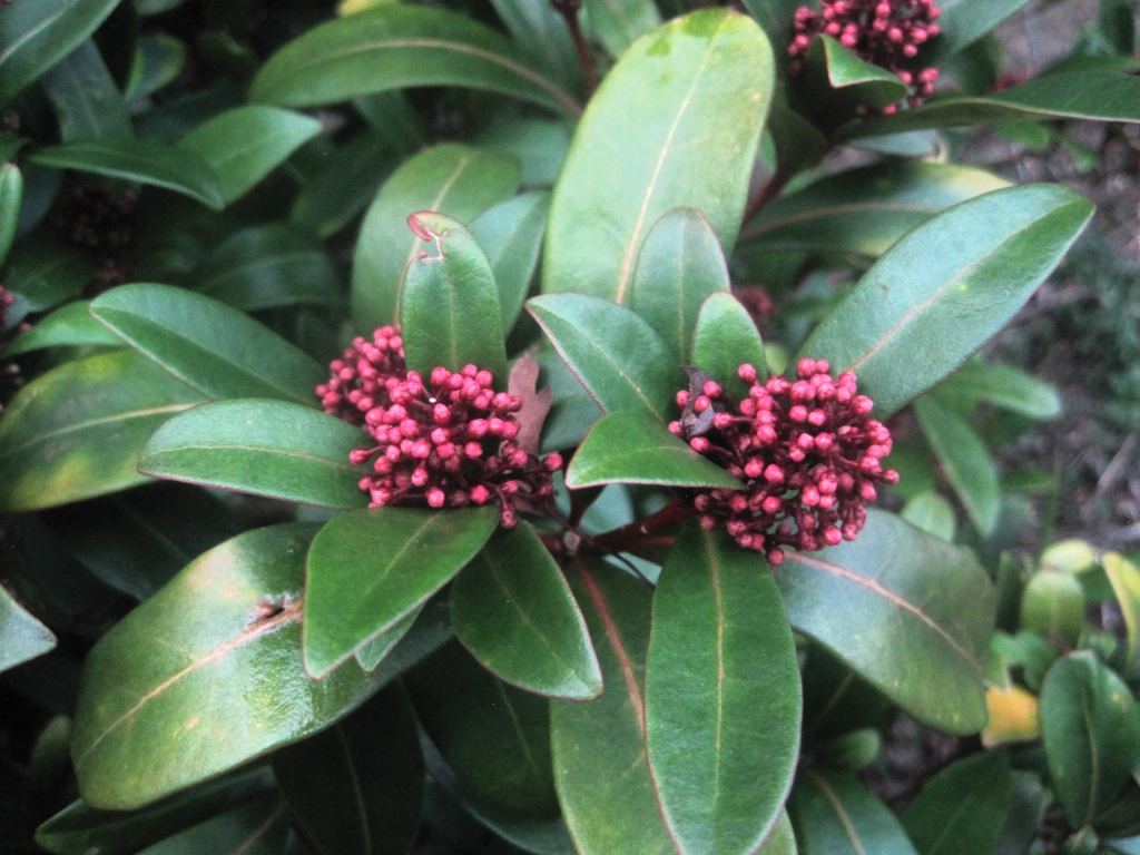 I have a male Skimmia which has raspberry pink flowers and a female Skimmia which produces scarlet berries from tiny white flowers.