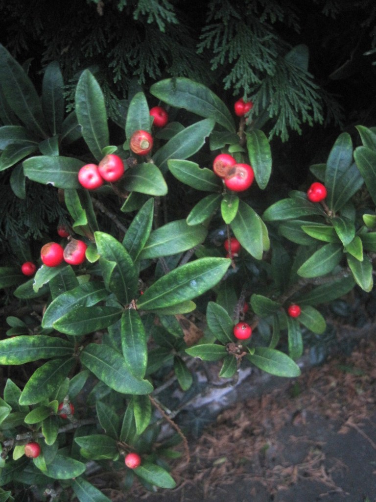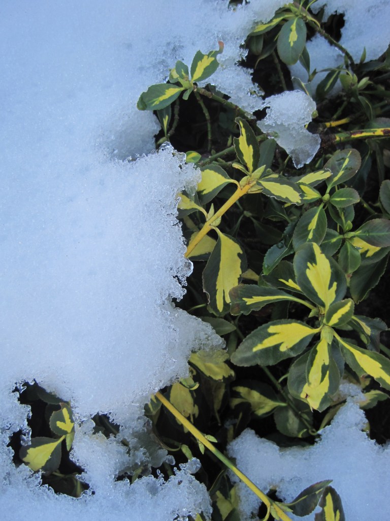 Evergreens are wonderful to have in Winter. Their bright glossy leaves shine out on dull days and give life to the garden. Euonymus shrubs are my favourites with their green and gold or green and cream variegated leaves. They also grow happily in our dry sandy soil.