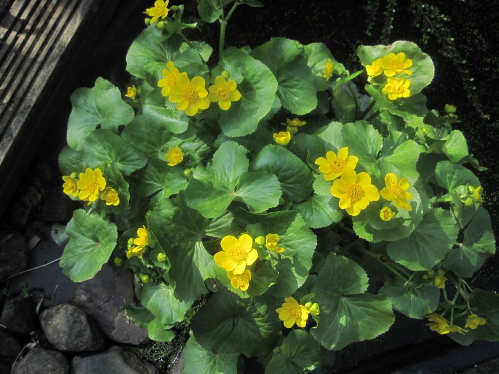 The beautiful marsh marigold (Caltha palustris) at the corner of the pond was magnificent until a few days ago. Sadly, the heavy rain and strong wind have flattened it and it looks very forlorn. Here’s how it looked before the weather took its toll.