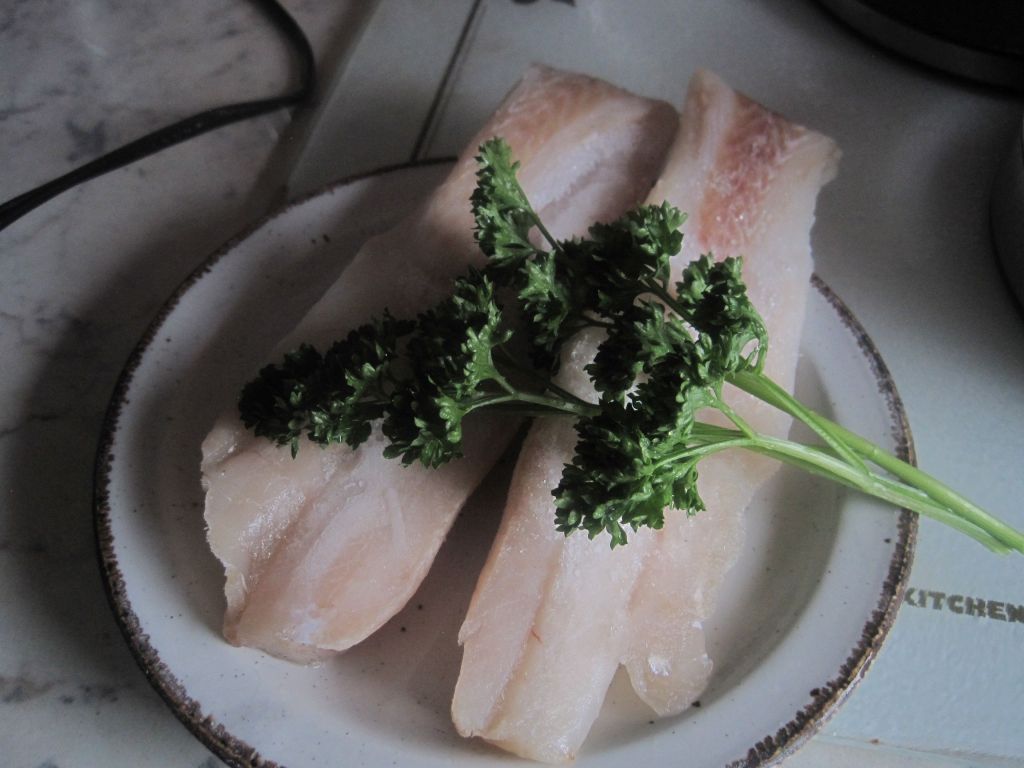 I wondered if they’d make good fish cakes. I partially thawed two fillets, dabbed them a bit with kitchen paper then chopped them into pieces. I put them in the food processor with 50g of bread ( cut off crusts), a sprig of parsley from the garden and the juice of half a lemon. Sprinkled with salt and pepper and whizzed them all together. I didn’t add onion or garlic because that would overwhelm the delicate flavour of the fish.