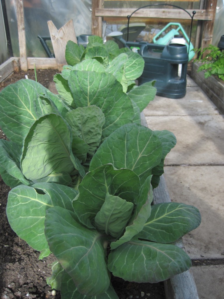 The Spring cabbages are growing now. Half of them were munched by caterpillars and are looking very ragged but the other half are doing well. It’s a mystery how these particular caterpillars have ended up in the tunnel. That’s gardening for you! Nature has some sneaky tricks.