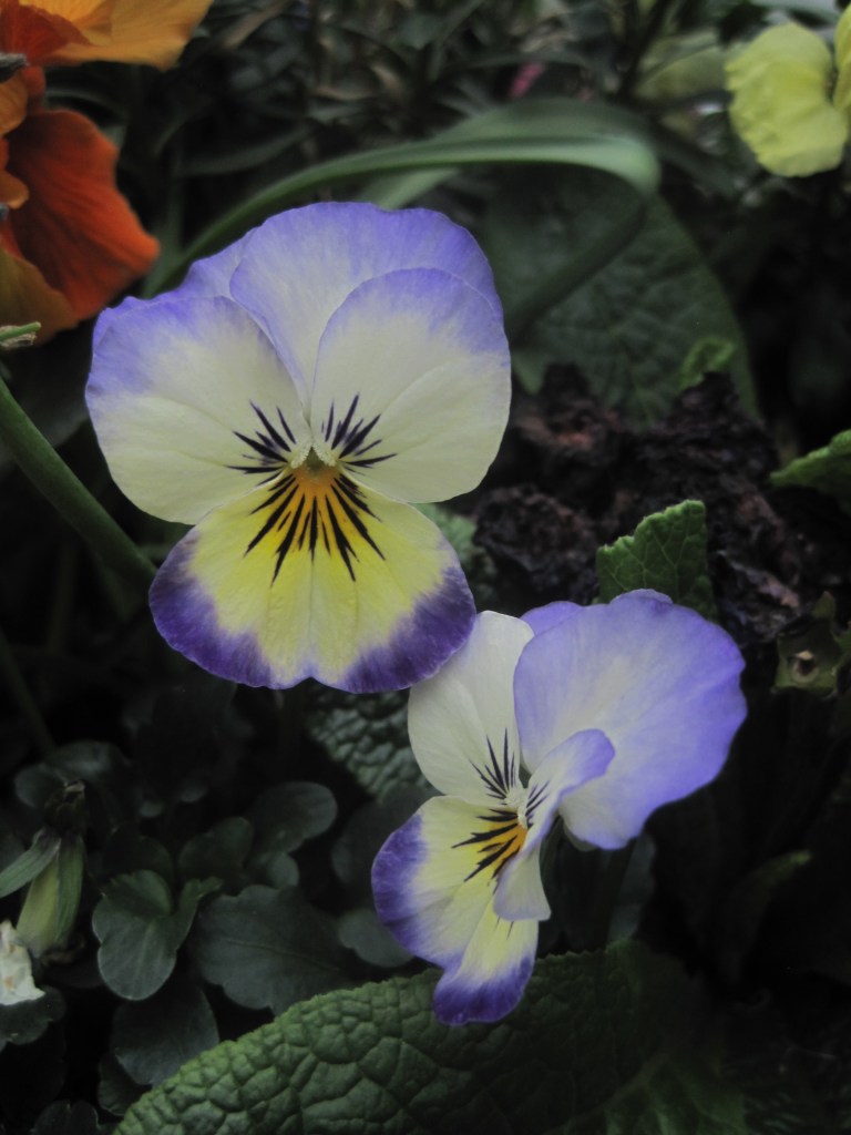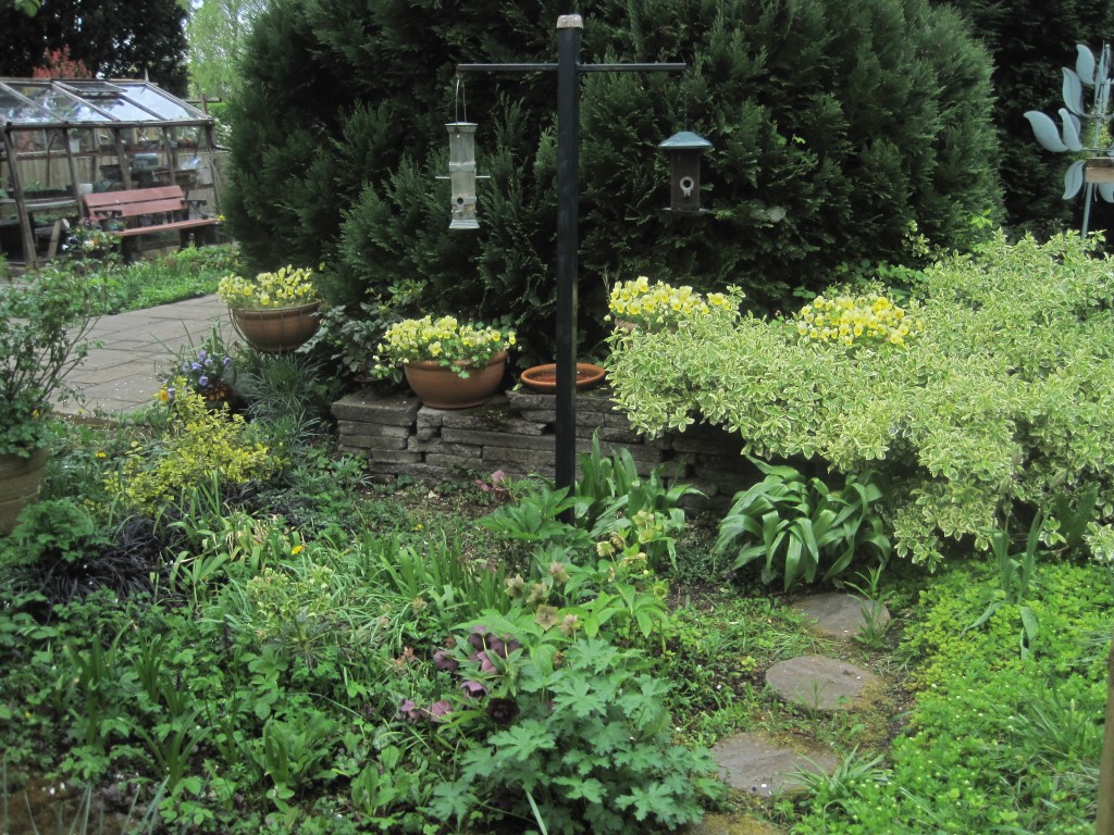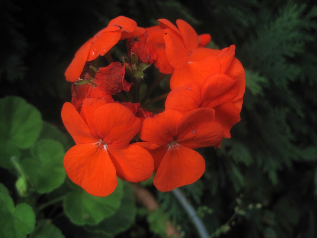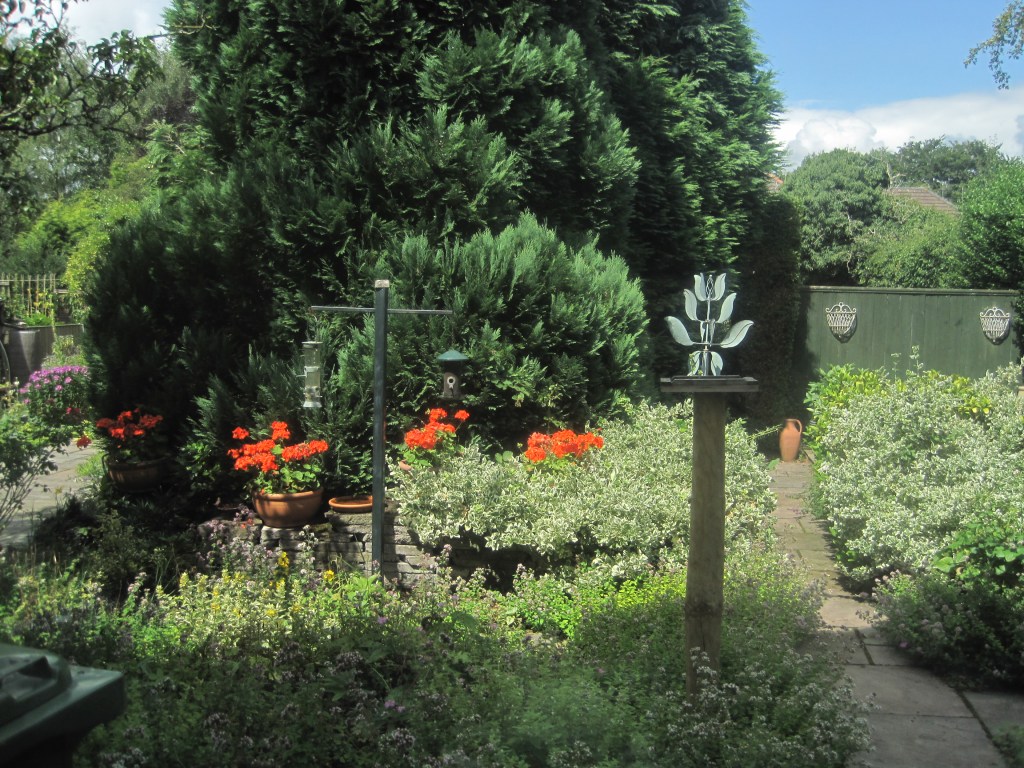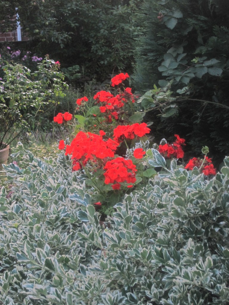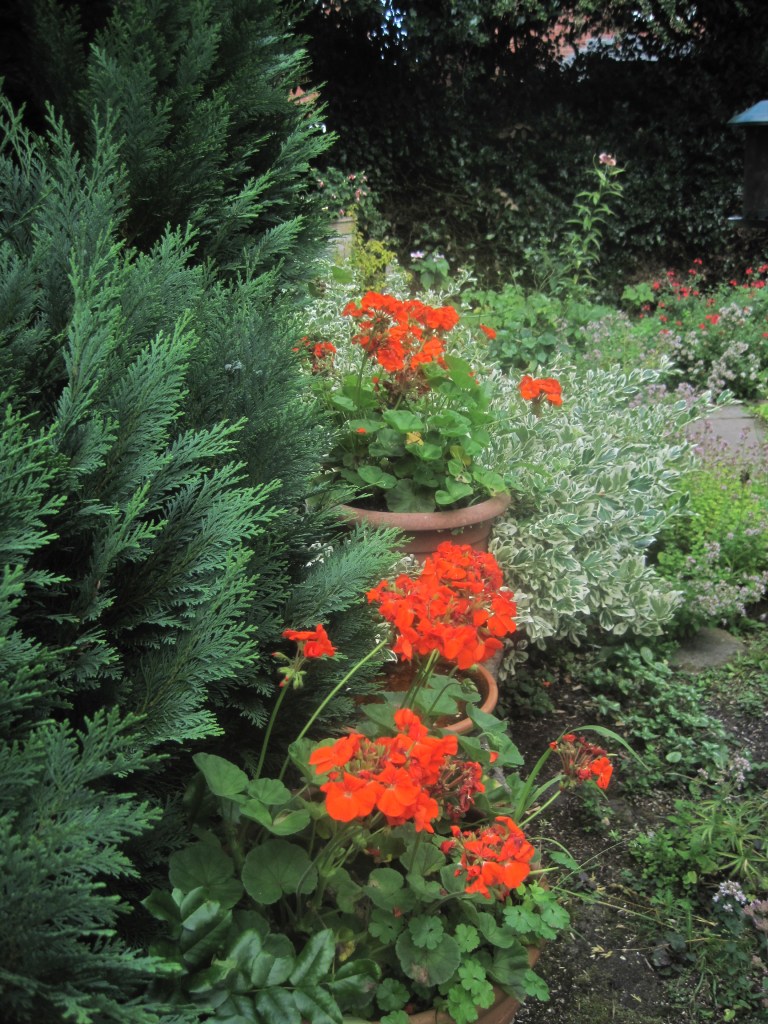 Pelargoniums ( also known as Geraniums) have made a dramatic splash of vivid colour against the dark green of the conifers. I think these are called “Orange Dream”,