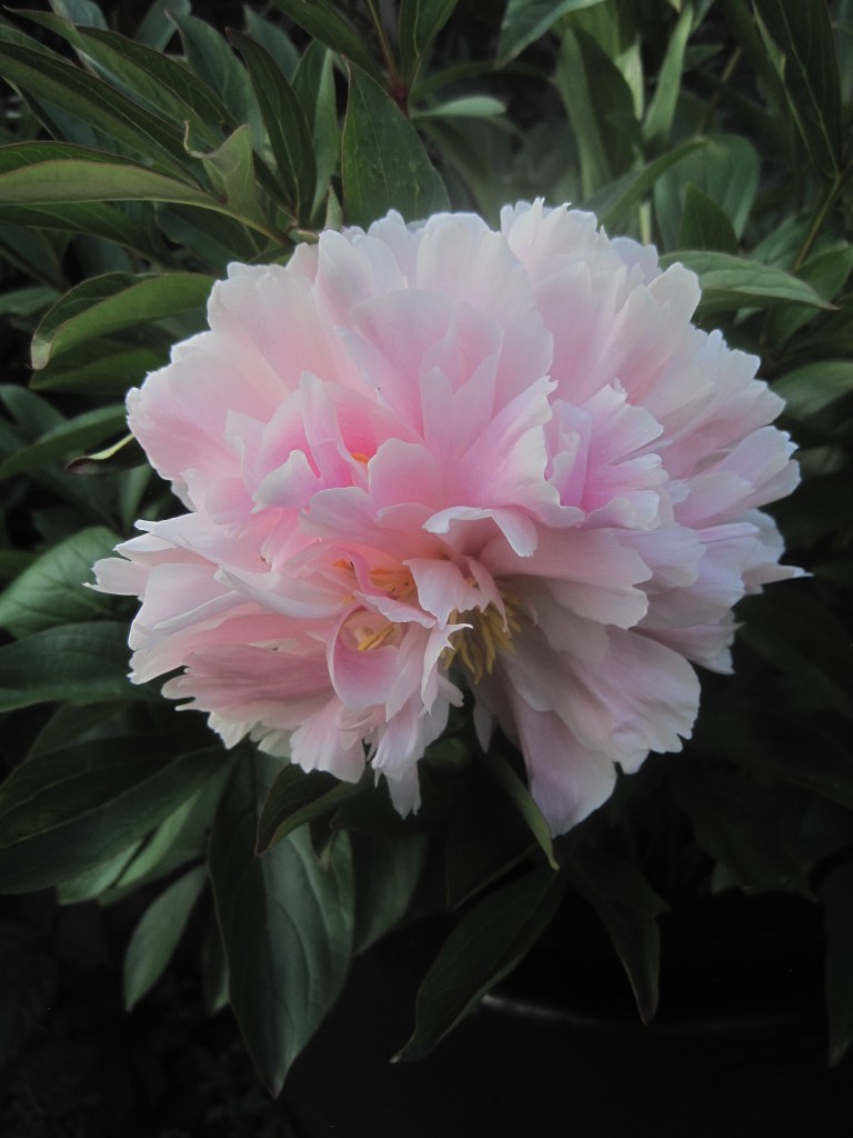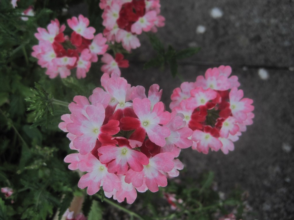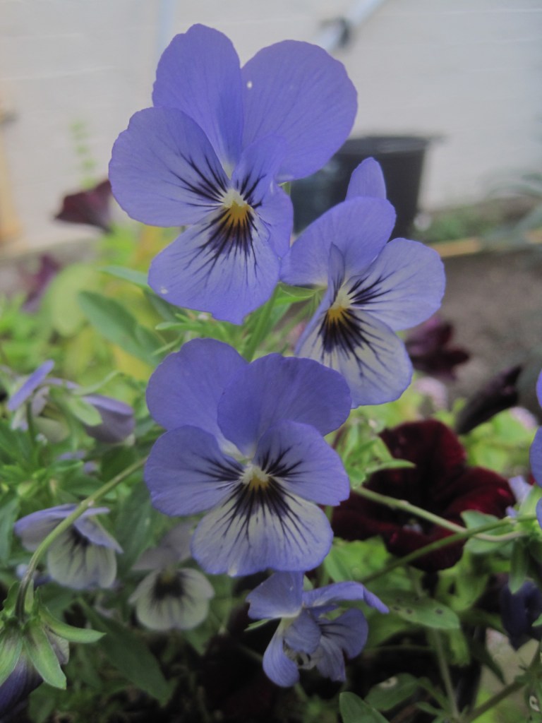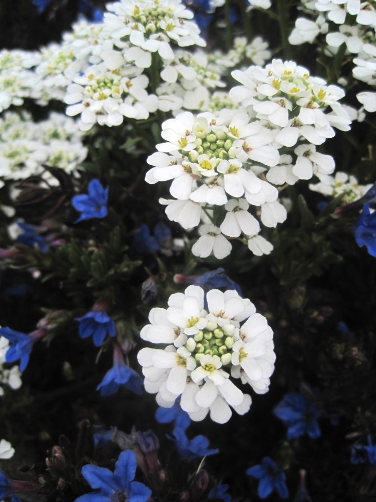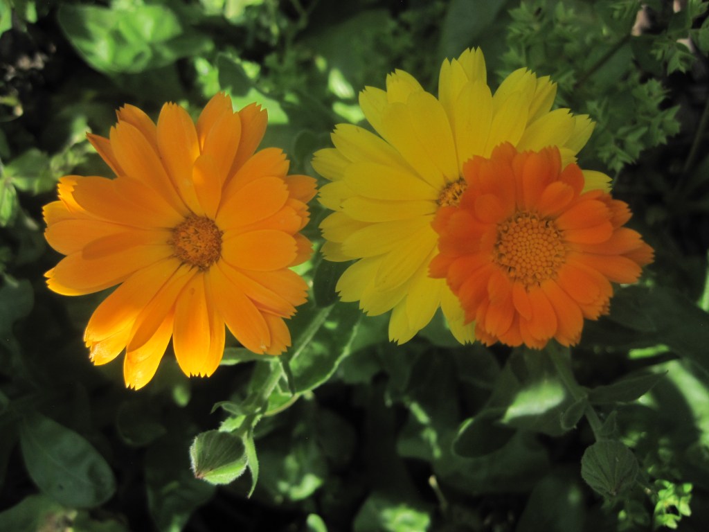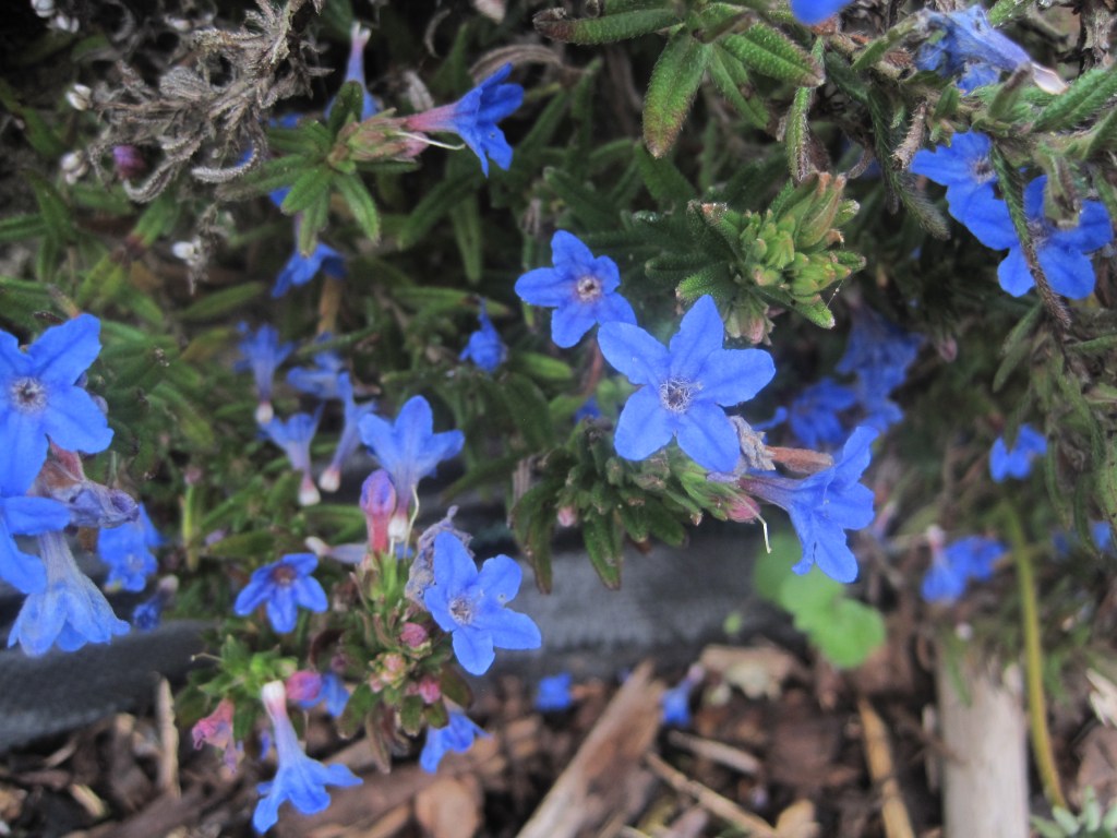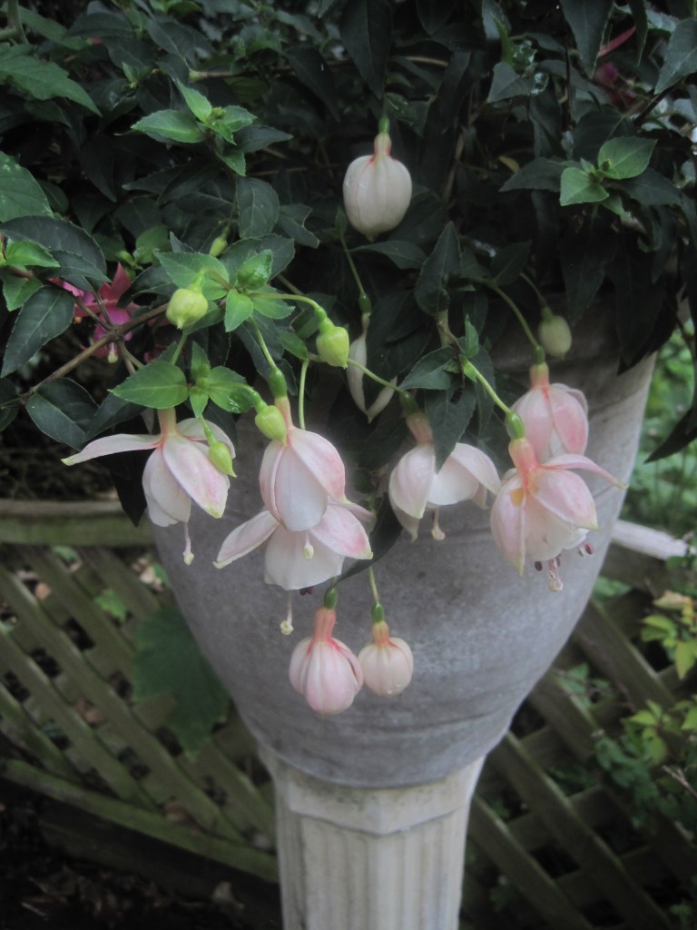 Pelargoniums ( also known as Geraniums) have made a dramatic splash of vivid colour against the dark green of the conifers. I think these are called “Orange Dream”,