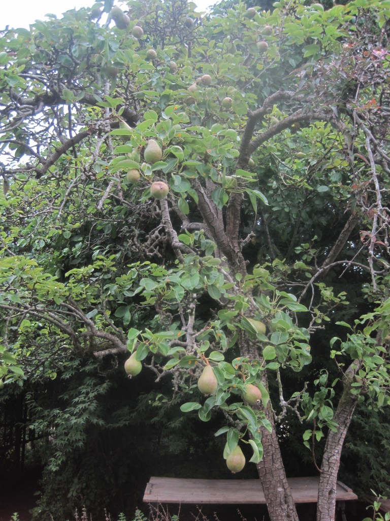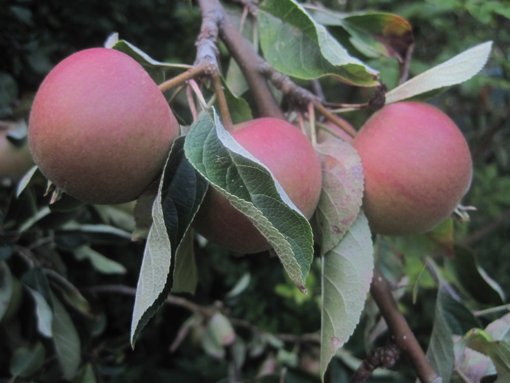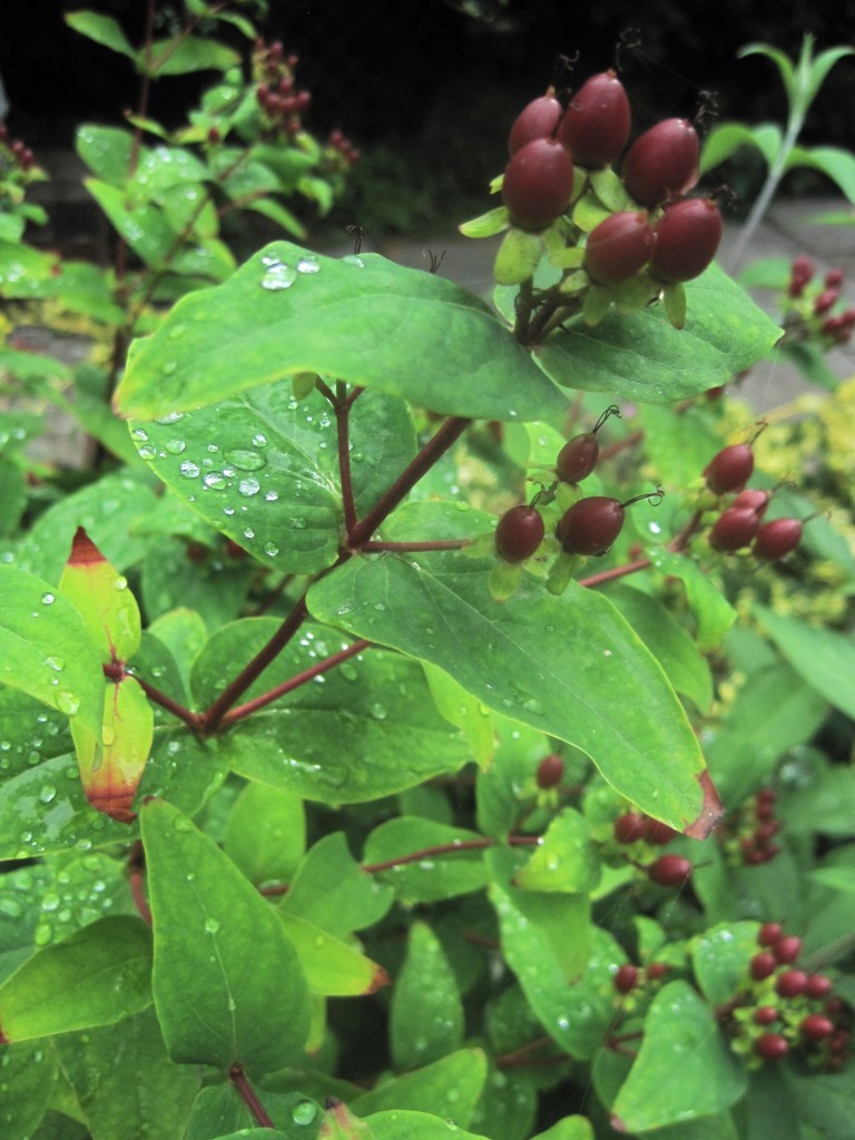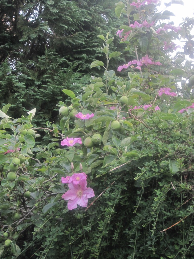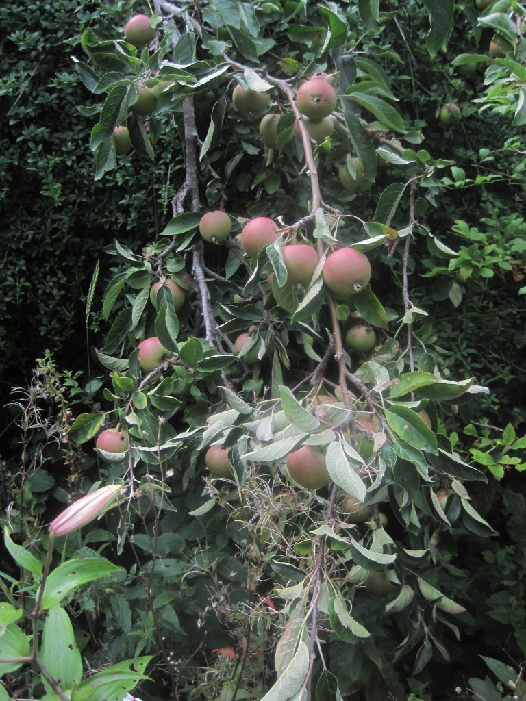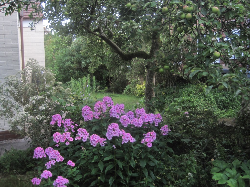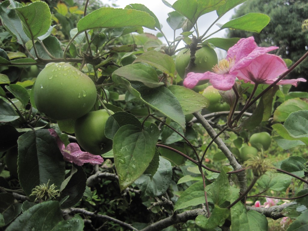 The fruit and berries are swelling ready for their autumn glory. Viburnum berries and Hypericum are almost in full colour and the apples are taking on a rosy hue. Windfalls are dropping now and the birds and insects are taking their share on the ground.