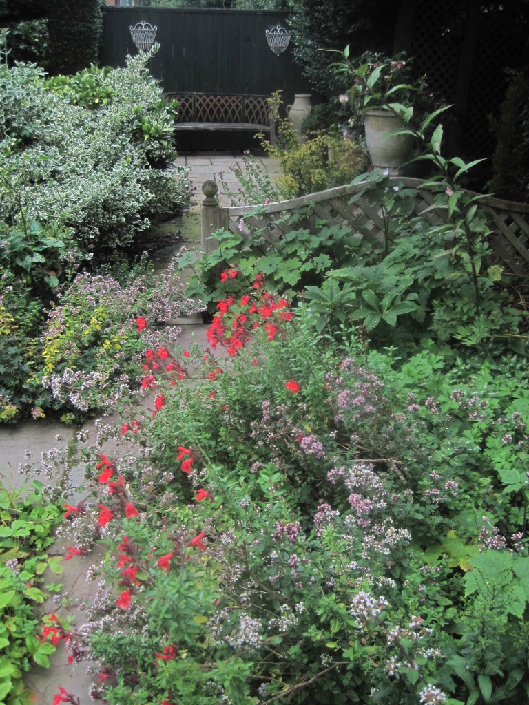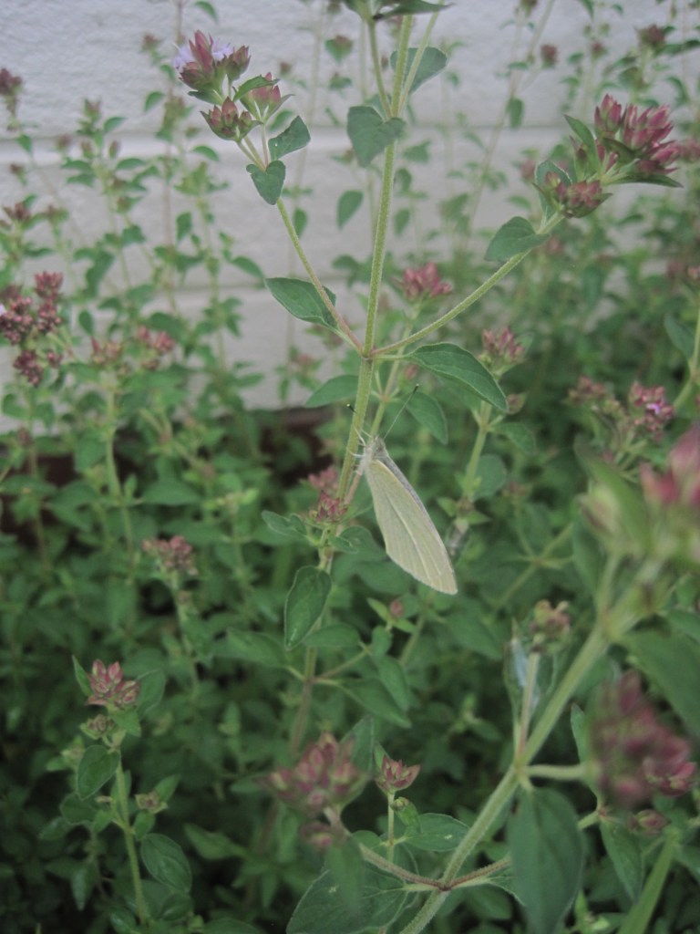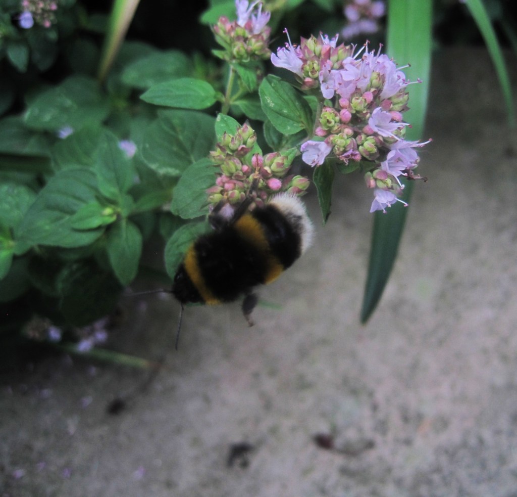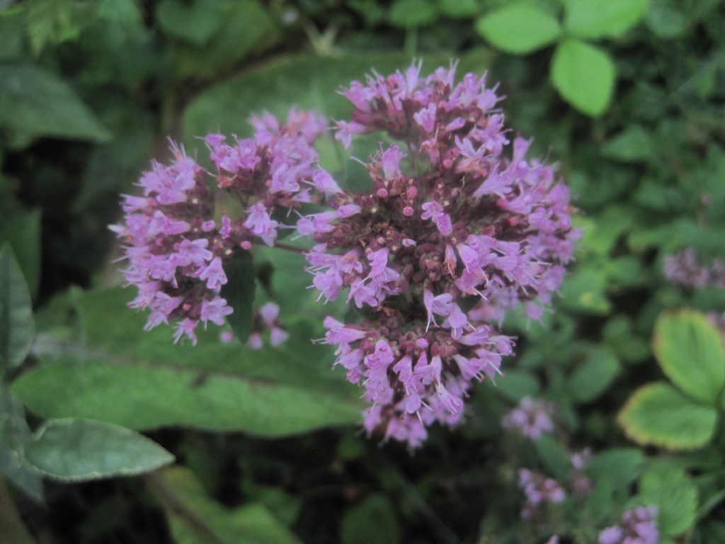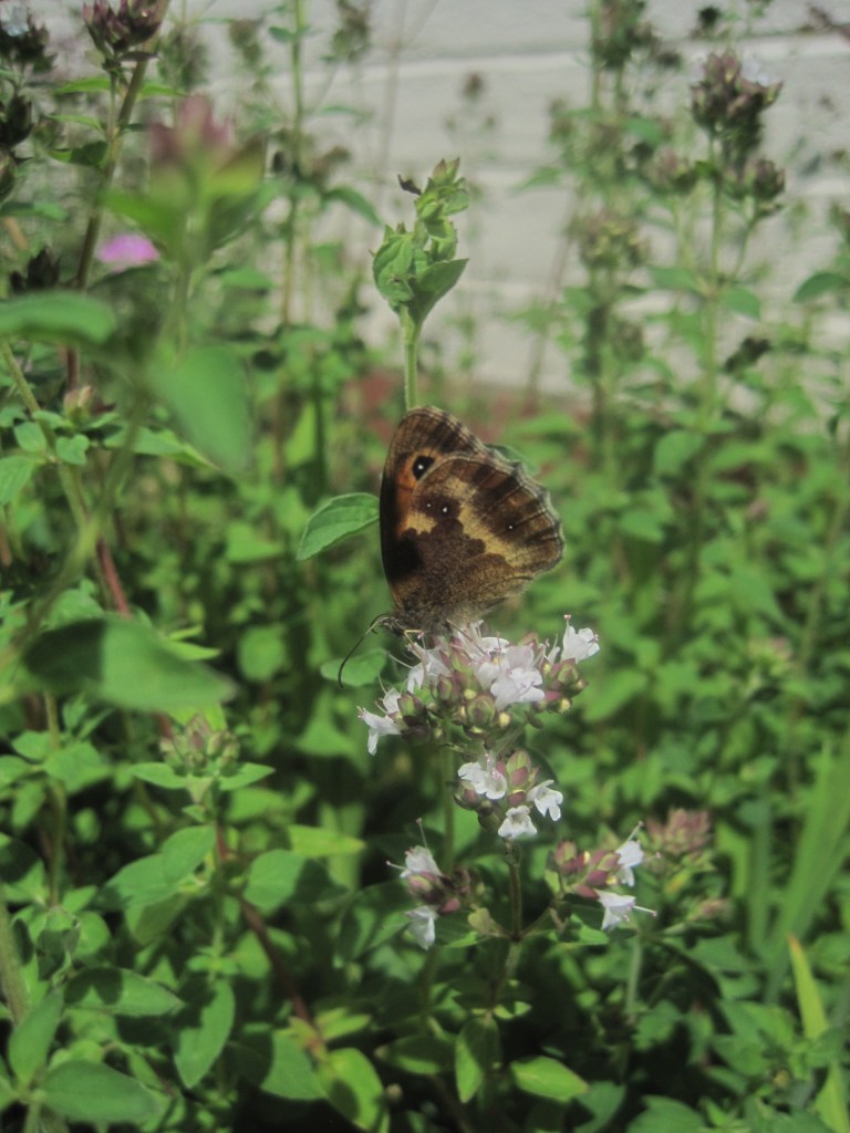 Marjoram, an edible herb, grows well in our poor soil and although it tends to spread a bit too freely I love it. It attracts clouds of bees and some lovely butterflies like the small and dainty Gatekeepers. The pink flowers are pretty and the leaves have a wonderful scent.