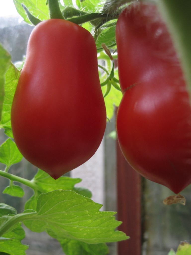 My “Roma” tomatoes are not doing well this year. I thought I might have put them into the greenhouse too early but my neighbour says he started his very early and they’re producing abundant crops. He gave me a generous basketful, which I’m very grateful for. I have a few of my own but very few indeed. Strangely, the three spare plants I put out in the garden instead of the greenhouse have more tomatoes in relation to the small size of the plants. “Roma” are our favourite tomatoes. A plum type, they’re flavourful and fleshy with thin skins.