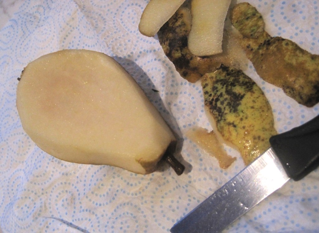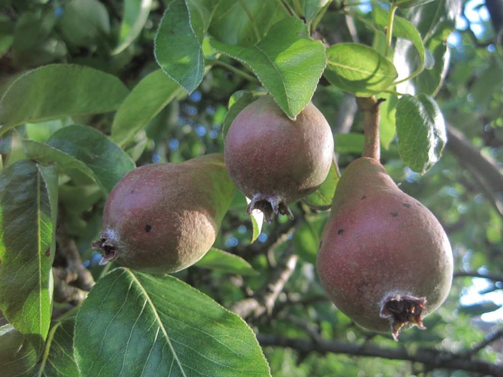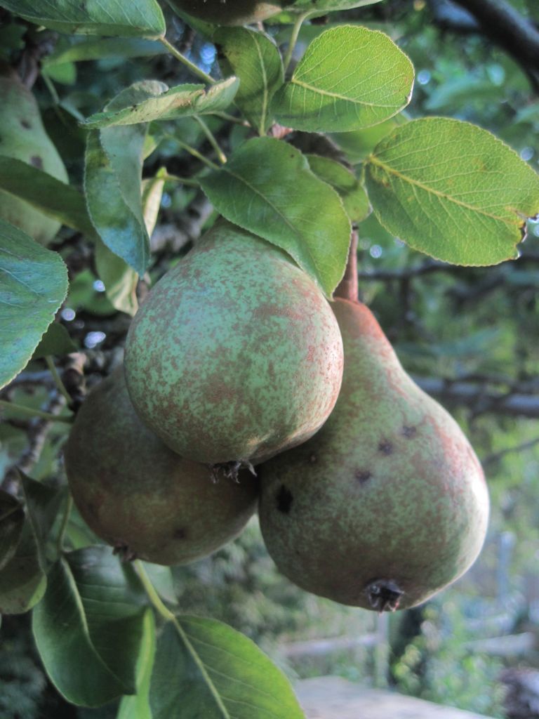 The Conference pears have been wonderful. They seem bigger this year and perfect apart from blemishes on the skin. Sweet, delicious flesh once they’ve been peeled. I was a bit impatient waiting for them to ripen so I cooked a few. Just peeled and quartered after removing pips and then popped in the microwave with a little water and a sprinkle of sugar. Mmm. Lovely.