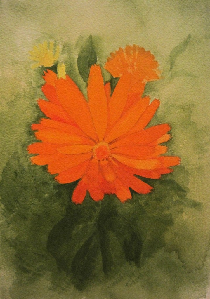 I’ve painted a little picture of a marigold from a photo I took in the garden. Drawn with pencil and painted with gouache. I’m a bit tired of doing flowers though. I need to explore my photos for a Still Life subject. Something to look forward to during the Winter.