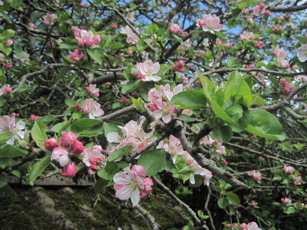 The “Veilschenblau” rose is scrambling prettily through one of the pear trees. It has an unusual purpley flower and although it’s a bit temperamental I love to see it when it performs well. “Paul’s Scarlet” is also blooming now with rich red flowers and my favourite campanulas have self-seeded everywhere with their wonderful blue bells.