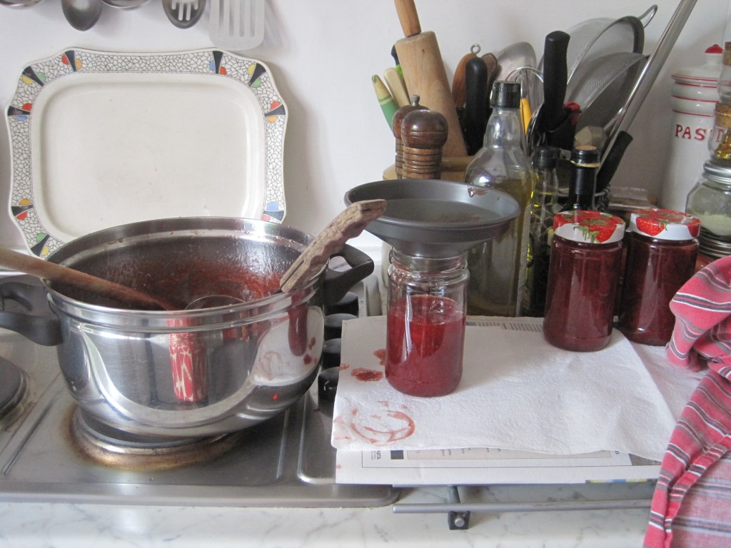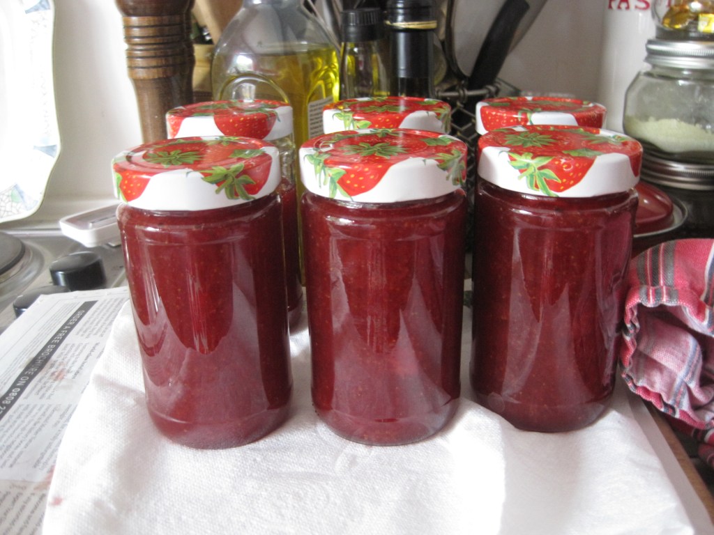 Indoors I made some more pickled red cabbage. I didn’t grow the cabbages – something I really ought to do. I love the pickle when it’s fresh and still a bit crunchy. One of the easiest pickles to make, I think. Just shredded cabbage, and vinegar boiled with pickling spices, strained through a sieve and poured over in clean hot jars. Simple and delicious. Looks great too.